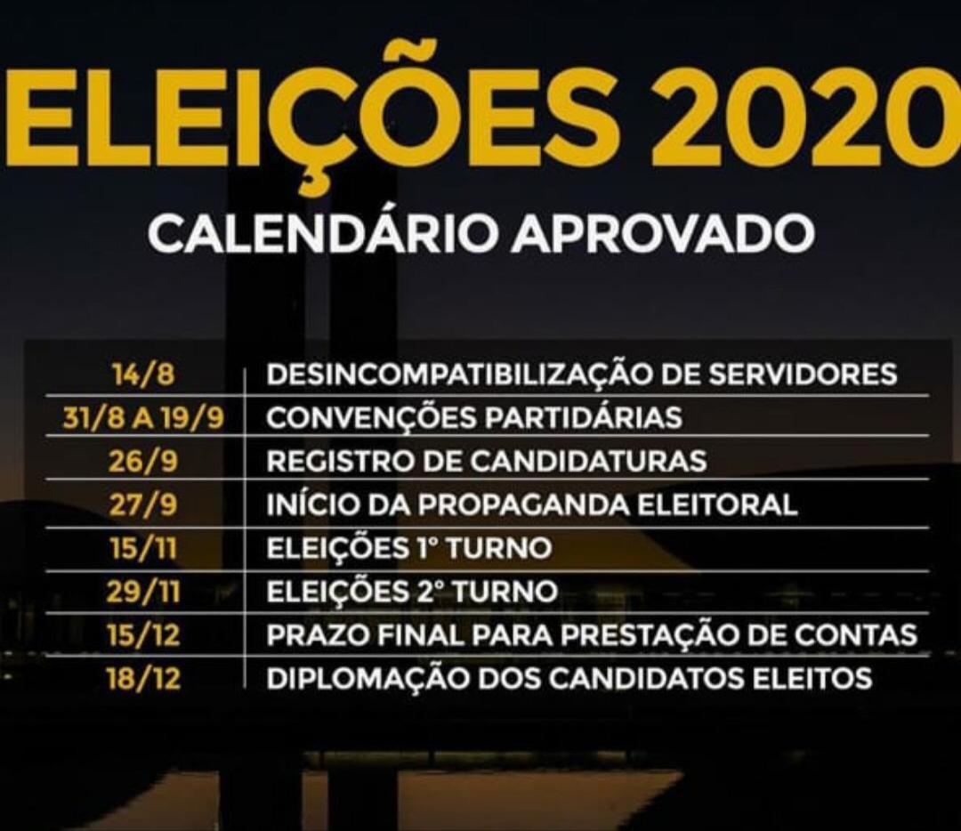 Por causa da pandemia, as eleições municipais de 2020 tiveram o calendário alterado por meio de emenda constitucional aprovada pelo Congresso. O primeiro e o segundo turnos estão marcados para os dias 15 e 29 de novembro, respectivamente.
