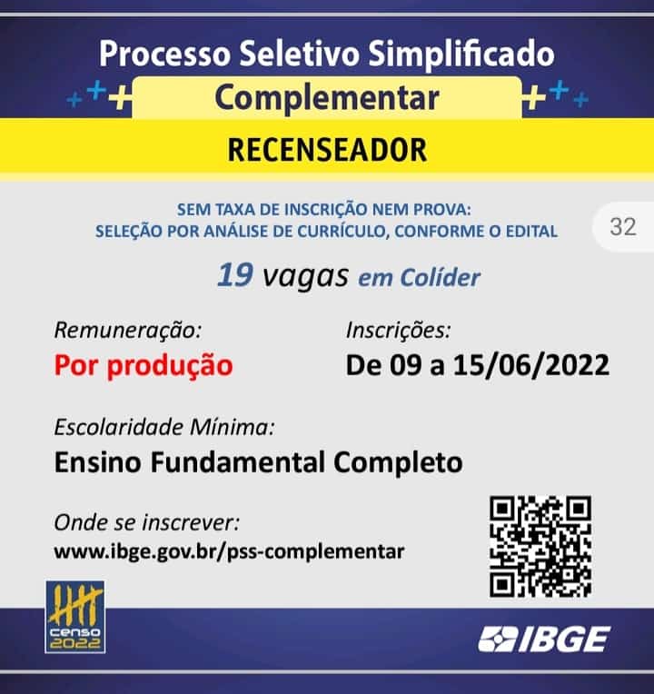 A exigência é de nível fundamental completo, não há taxa de inscrição nem haverá prova, pois a seleção é feita por análise de currículos de quem se inscrever, por meio de formulário no site do IBGE (https://www.ibge.gov.br/pss-complementar). “Os candidatos devem preencher o formulário com os dados relativos à formação e essa análise de títulos será classificatória. Quando forem convocados, eles precisam comprovar a titulação”, explica o coordenador de Recursos Humanos, Bruno Malheiros.