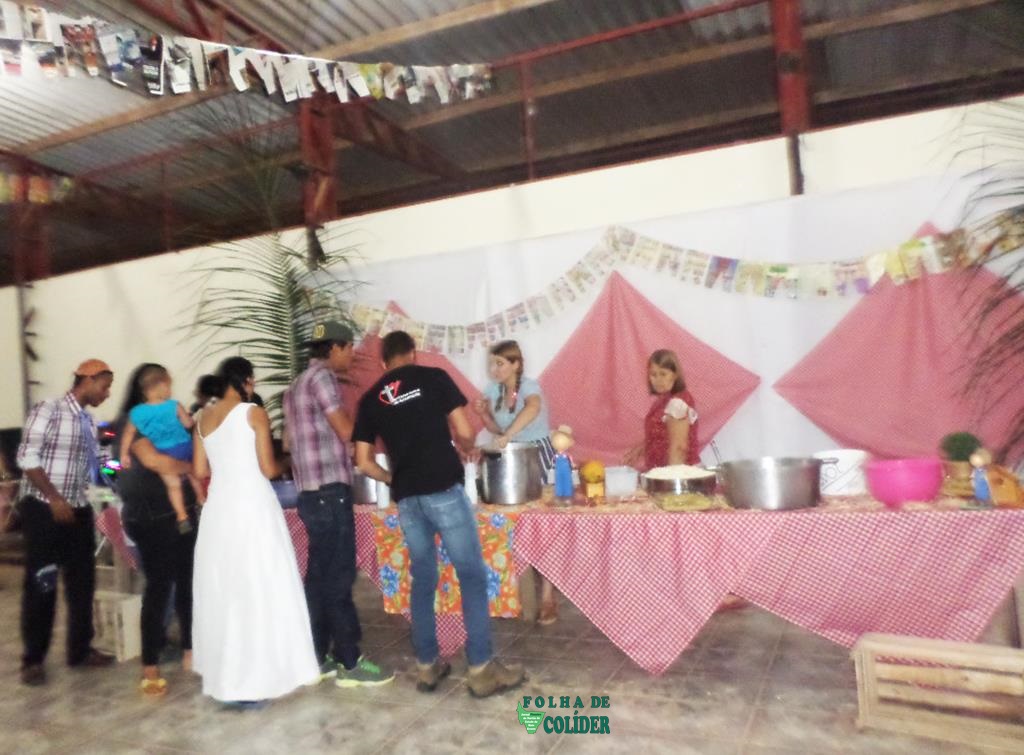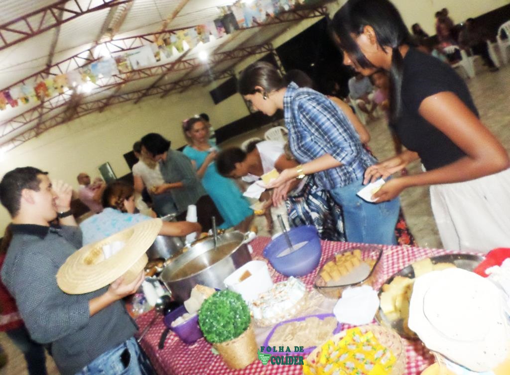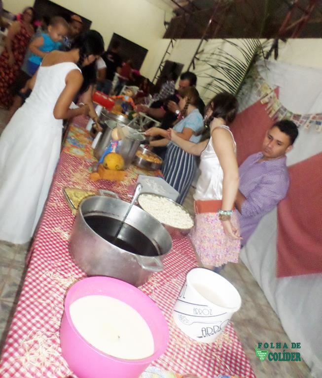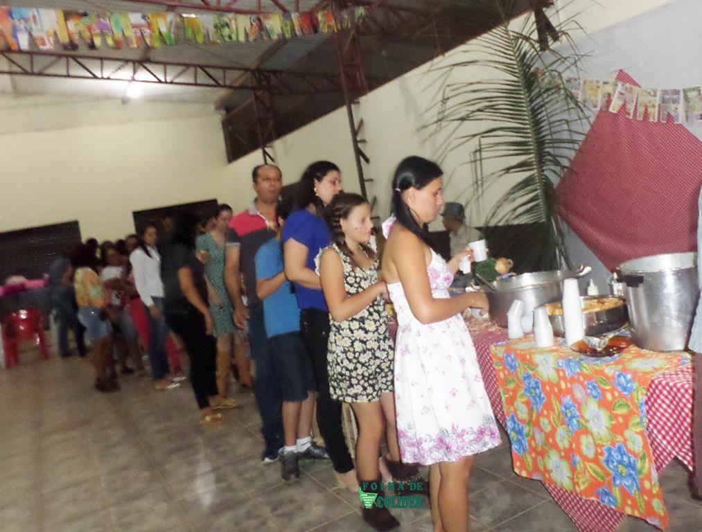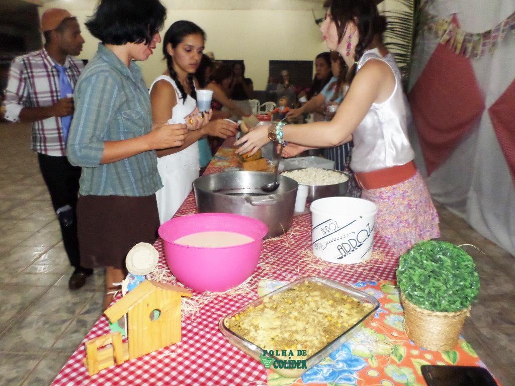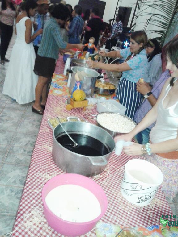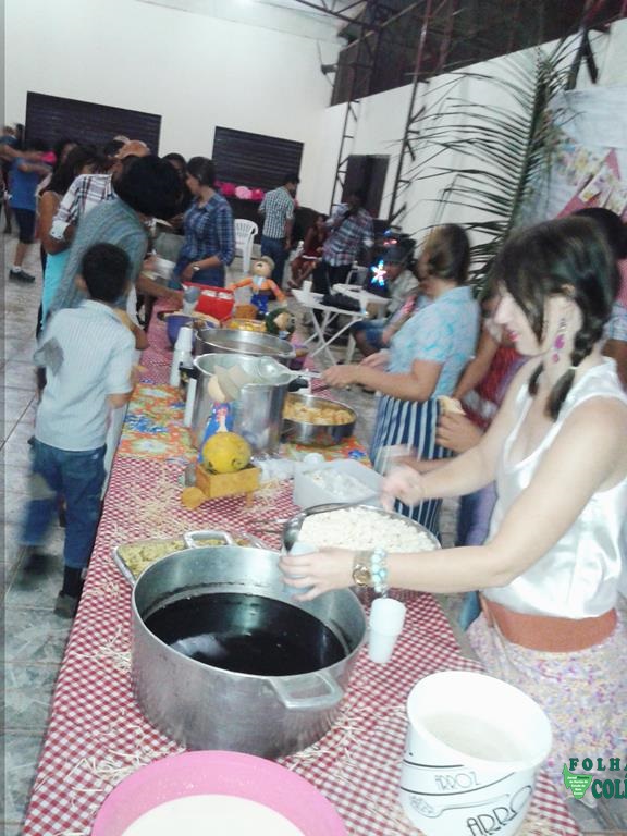 Quentão a base de suco e uva, huuumm, uma delÃcia!!! Pipoca, bolo de milho, chá de amendoim, bolos, doces, tortas, polentas,  paçoca de amendoim e muita brincadeira, tudo isso e muito mais, mas só depois do momento de oração, louvor e exortação da palavra de Deus pelo pastor Paulo Jesuel  à s mais de cem pessoas presentes, entre membros da igreja( componentes de células) e visitantes.