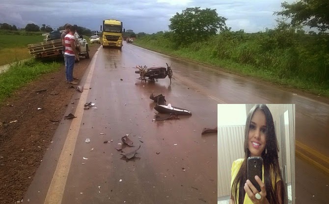 De acordo com a Policia Militar do municÃpio, a colisão frontal foi registrada próximo a um frigorÃfico e aconteceu no momento em que a vitima, identificada como Geizila Carla de Souza, que conduzia uma motocicleta Honda Biz, fazia a travessia de um quebra molas, e acabou sendo atingida por uma caminhonete Chevrolet D-20, que trafegava sentido contrário.
