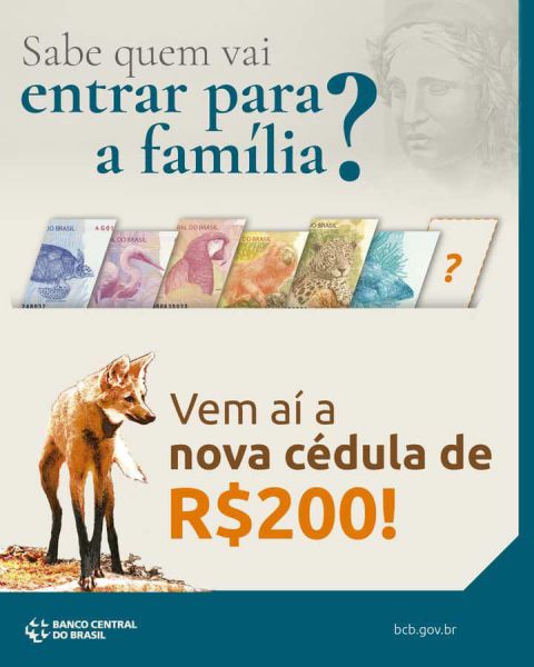 A nota de R$ 200, com a imagem do lobo-guará, começa a circular hoje (2). Segundo o Banco Central (BC), será a sétima cédula da família de notas do Real. Serão produzidos neste ano 450 milhões de unidades. Ainda não foi divulgada a imagem da nova cédula.
