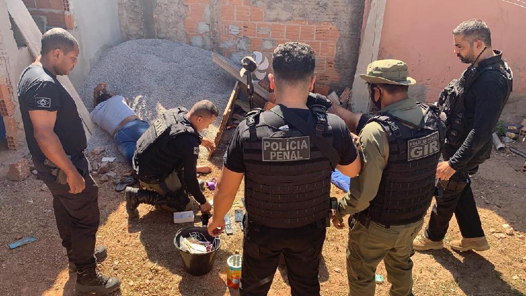 Eles passaram a seguir o drone e viram três homens e uma mulher em um veículo Gol e uma Honda Biz. Os quatro saíram correram quando viram os policiais penais e foram em direção a uma casa que fica a duas quadras da PCE, no bairro Jardim Industriário 2.