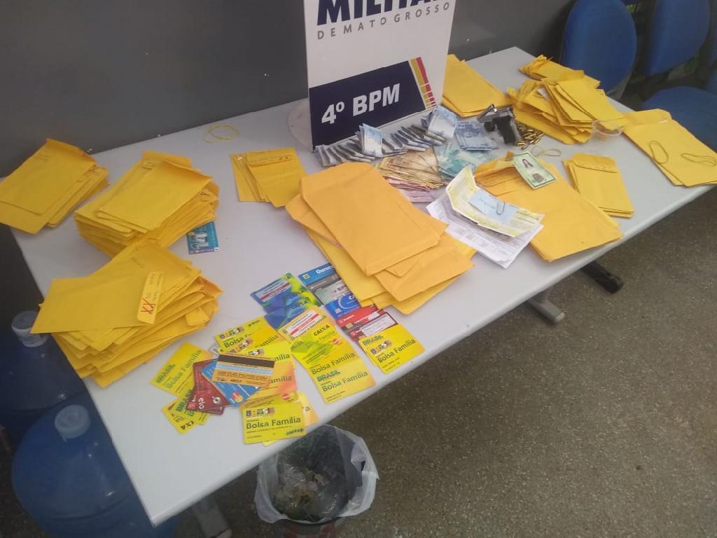 Militares do 4º BPM prenderam, nesta terça-feira (16), mulher de 35 anos com 268 envelopes, sendo 24 com cartões do bolsa famÃlia e 32 cartões de crédito diversos, com senhas e notas promissórias, além de uma pistola calibre 635, com carregador e 44 munições. Â