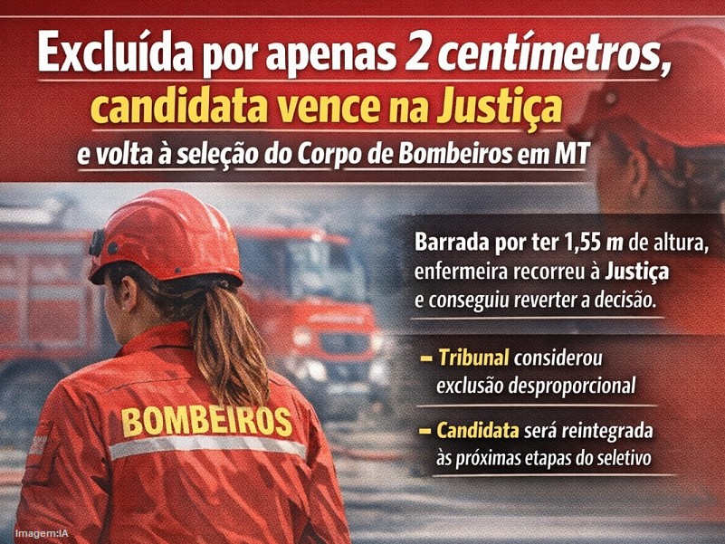 Uma diferença de apenas dois centímetros quase impediu que uma candidata continuasse o sonho de atuar na área da saúde dentro do Corpo de Bombeiros Militar de Mato Grosso (CBMMT). Eliminada do processo seletivo por não atingir a altura mínima prevista no edital, ela recorreu à Justiça e conseguiu reverter a decisão.