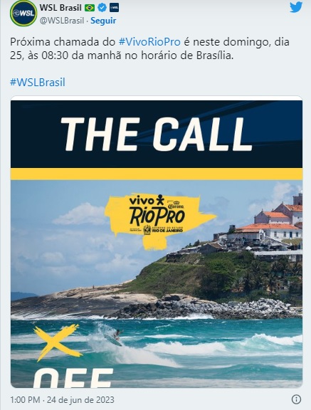 “Nós tentamos, fizemos três chamadas hoje [sábado] pela manhã, mas infelizmente o swell [ondulação] está decaindo, perdendo força, perdendo intensidade e tivemos que adiar a competição. Os head judges [chefes dos juízes] fizeram contagem de ondas e de qualidade, em cerca de 1 hora só entraram apenas 2 ondas na casa dos 5 pontos e não é para isso que estamos aqui. Então não tivemos outra opção a não ser cancelar a competição hoje. Mas estaremos amanhã [domingo] aqui para checar as condições pela manhã”, declarou o diretor de circuitos e competições da WSL, Renato Hickel.