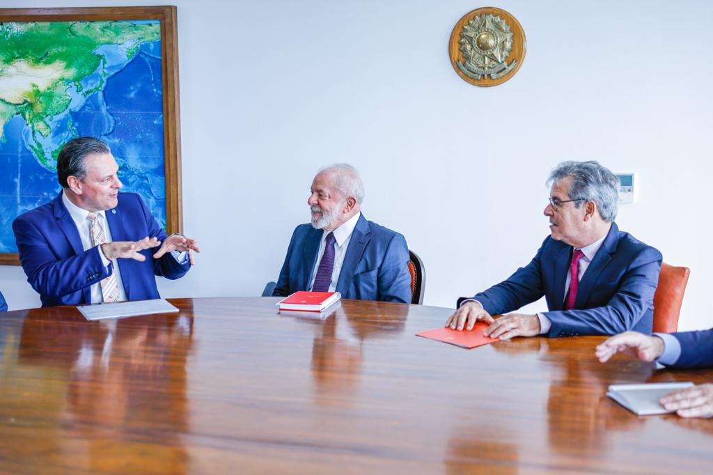 O ministro da Agricultura e Pecuária, Carlos Fávaro, o Secretário-Executivo do Ministério do Desenvolvimento, Indústria, Comércio e Serviços, Márcio Fernando Elias Rosa, e o presidente da ApexBrasil, Jorge Viana, participaram de uma reunião na manhã de hoje (4) com o presidente Lula no Palácio do Planalto, em Brasília.