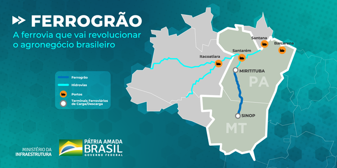Com 933 quilômetros de extensão, a Ferrogrão prevê investimentos iniciais no valor de R$ 8,4 bilhões. O projeto ainda contempla os ramais de Santarenzinho, entre Itaituba e Santarenzinho, no município de Rurópolis (PA), com 32 quilômetros, e o ramal de Itapacurá, com 11 quilômetros. O início das obras está previsto para o primeiro semestre de 2021. Os vagões poderão levar milho, soja e farelo de soja, com capacidade para transportar também óleo de soja, fertilizantes, açúcar, etanol, DDG de milho, algodão, carnes e derivados de petróleo.
