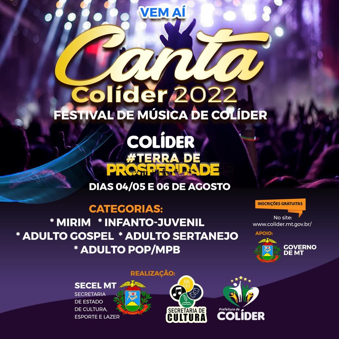 O Festival de Música de Colíder, denominado Canta Colíder 2022, tem como proposta ser um dos eventos mais importantes da agenda cultural do Nortão de Mato Grosso, pois será caracterizado por sua diversidade de categorias de música, e é um evento esperado por todos.