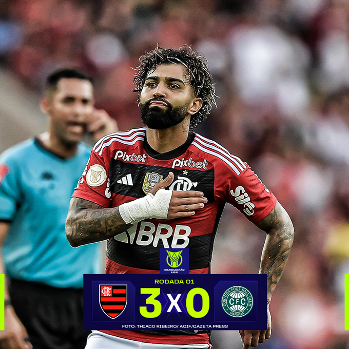 Depois de dias turbulentos que culminaram na troca de técnico, o Flamengo estreou no Campeonato Brasileiro da melhor forma possível. O Rubro-Negro fez 3 a 0 no Coritiba, na tarde deste domingo (16), no Maracanã e fecha a rodada inaugural da competição empatado com o Fluminense na liderança, com três pontos e três gols de saldo. Ayrton Lucas, Gabriel e Pedro foram os artilheiros da tarde.