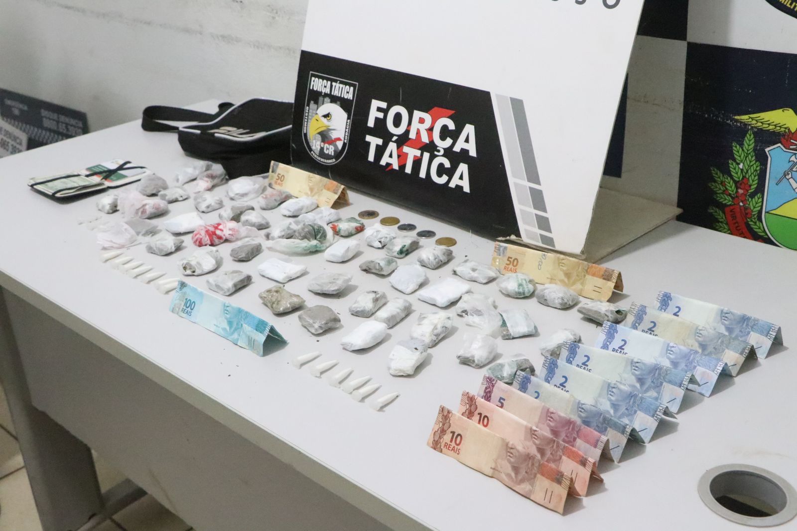 Dentro do quarto do suspeito, a equipe da Força Tática encontrou uma bolsa contendo mais 45 porções de maconha e 13 porções de cocaína, além da quantia de R$ 239,00 em dinheiro.