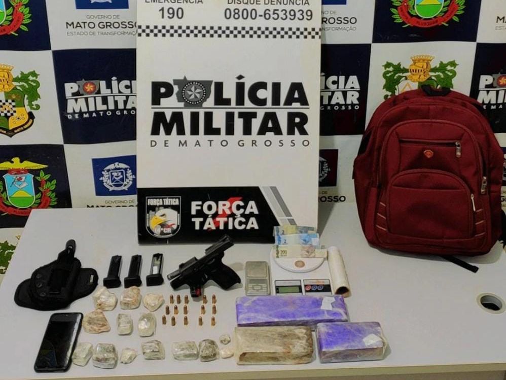 Policiais militares da Força Tática do 14º Comando Regional prenderam em flagrante um homem de 25 anos por tráfico de drogas e porte ilegal de arma, na noite desta terça-feira (25.04), em Nova Mutum. Na ação, foram apreendidas uma arma de fogo, munições, tabletes e porções de entorpecentes.
