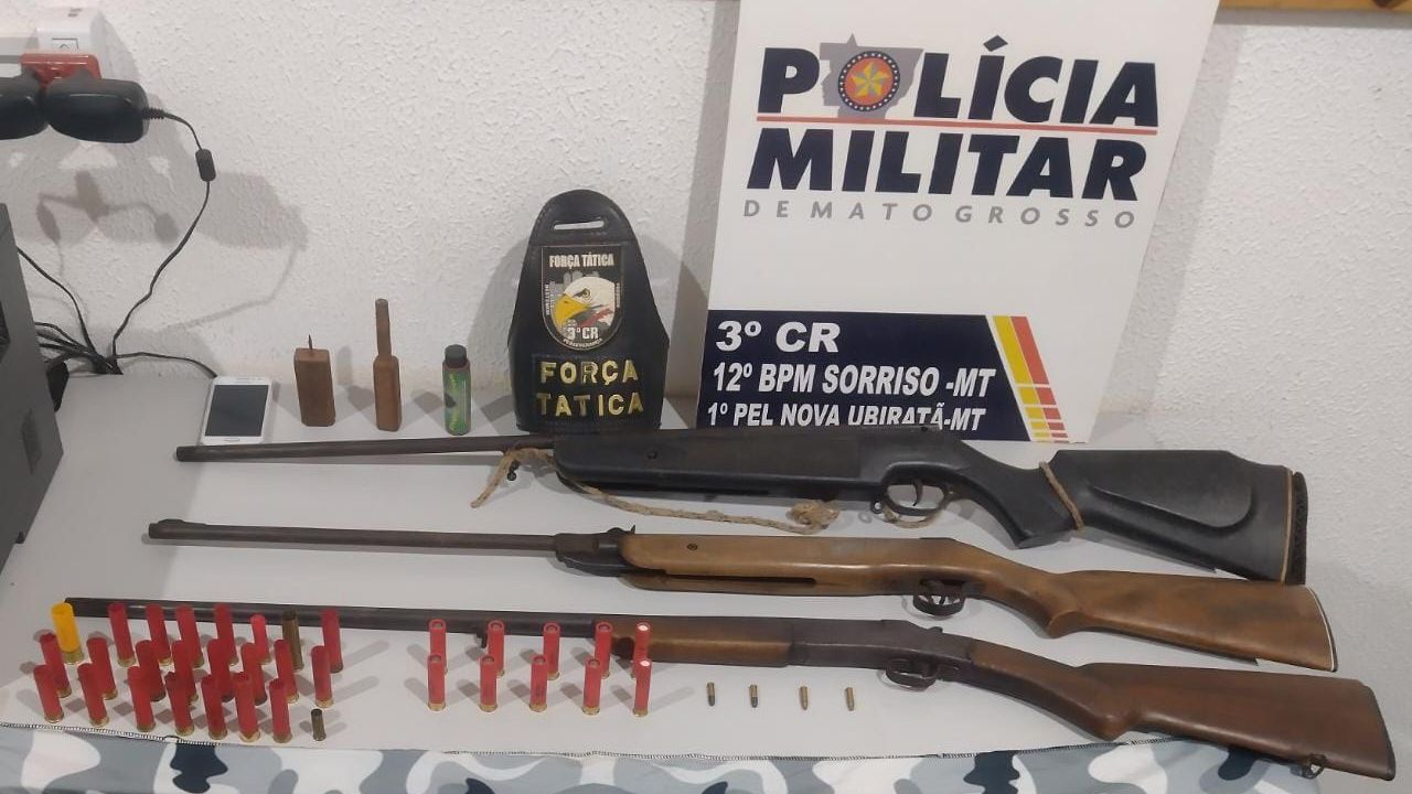 Policiais militares da Força Tática do 3º Comando Regional prenderam em flagrante um homem de 28 anos por porte ilegal de arma de fogo, na tarde desta sexta-feira (21.07), na zona rural de Nova Ubiratã. Com o suspeito, foram apreendidas três espingardas e 38 munições de diversos calibres.
