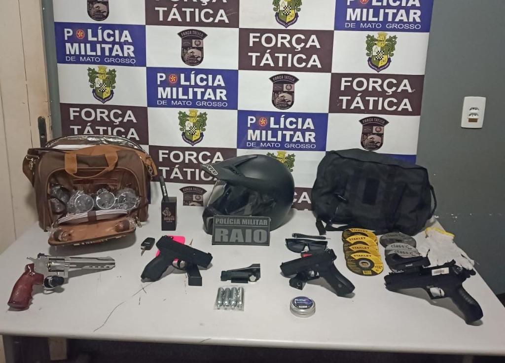 Na casa dos suspeitos, localizada na Chácara Nossa Senhora da Guia, as equipes encontraram, além dos simulacros e botijões para recarga de CO2, miras ópticas holográficas, um pote de chumbinho para rifle 4.5, chave para manutenção de simulacro de arma de fogo e diversos utensílios de cozinha.