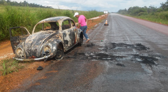 Um Fusca, ano 63, pegou fogo na tarde dO sábado (04) na MT-320, aproximadamente 20 quilômetros de Marcelândia. Segundo informações do condutor, no momento do incidente estava ele e sua mulher no veÃculo. Eles conseguiram sair a tempo e não se feriram.