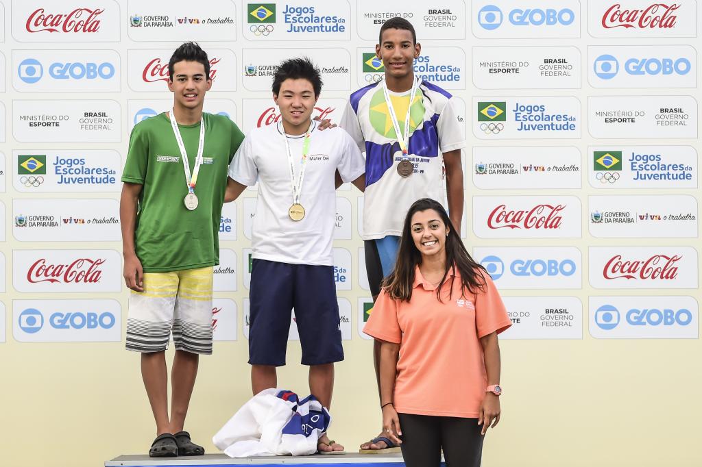 Antônio, do lado direito, durante a premiação dos melhores na natação dos Jogos Escolares em João Pessoa – Foto por: COB
