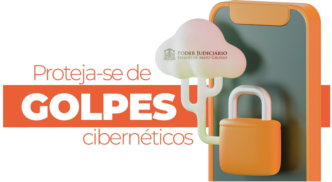 Primeira imagem: arte gráfica em 3d, com celular e um cadeado ligado à uma nuvem sendo projetados da tela do aparelho. Na nuvem está aplicada a marca do Poder Judiciário de Mato Grosso. Ao lado do smartphone está escrito ‘Proteja-se de golpes cibernéticos’.