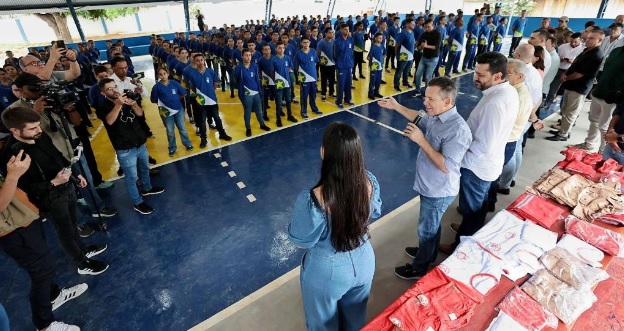 Mauro Mendes também entregou os uniformes aos alunos da nova Escola Estadual Militar Dom Pedro II Coronel Antônio Paes de Barros. A unidade passou por reforma, ampliação e ganhou uma quadra poliesportiva.
