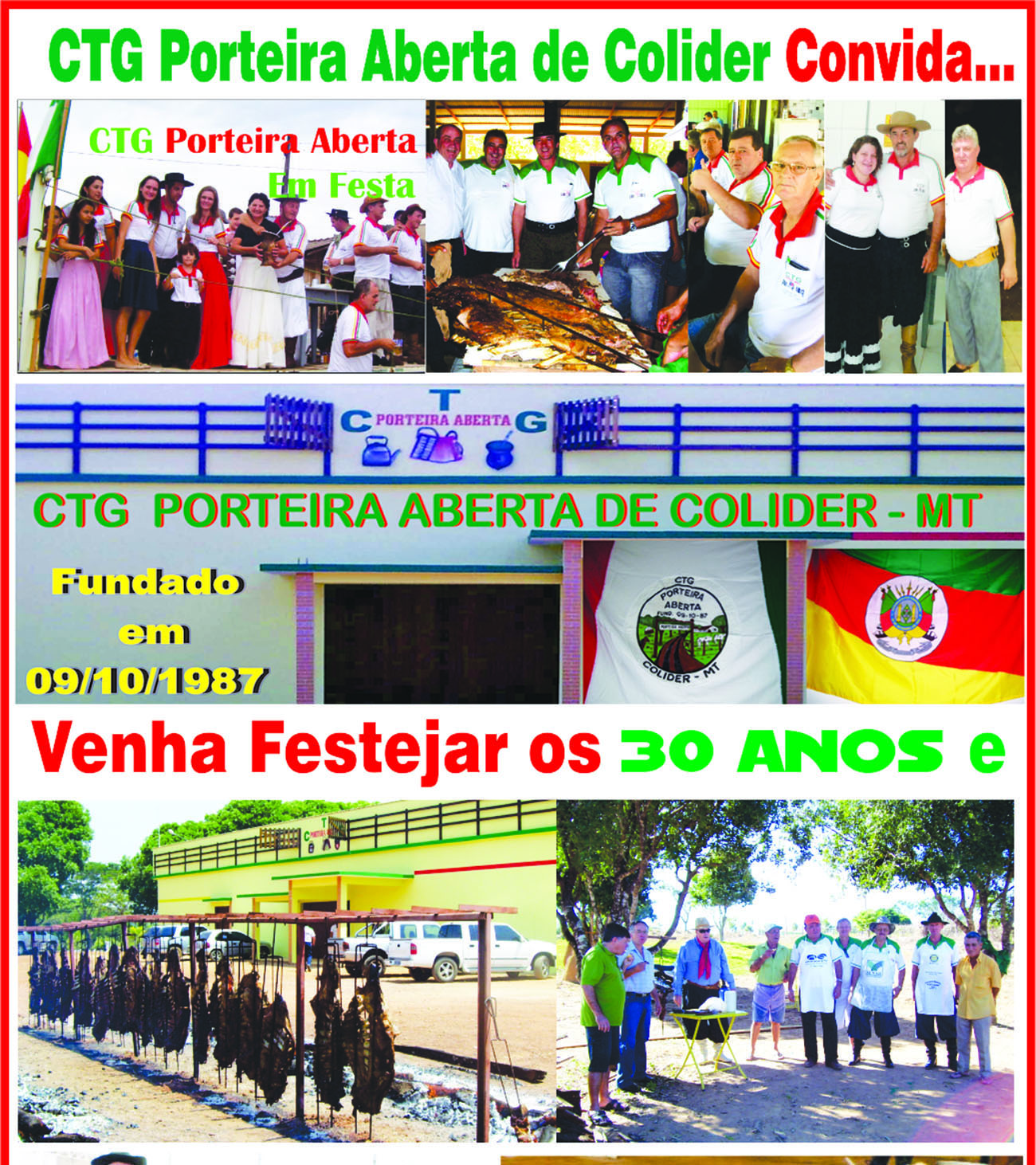 O Centro de Tradições Gaúchas Porteira Aberta de Colider, através da sua patronagem presidida por Geraldo Antonio Fhur, mantendo vivas as tradições gaúchas, já prepara com muito carinho uma recheada programação sócio, cívica e cultural em comemoração a SEMANA FARROUPILHA 2017, cuja data é celebrada em 20 de setembro, bem como a comemoração do Aniversário de 30 Anos do CTG Porteira Aberta de Colider, fundado em 10 de outubro de 1987.