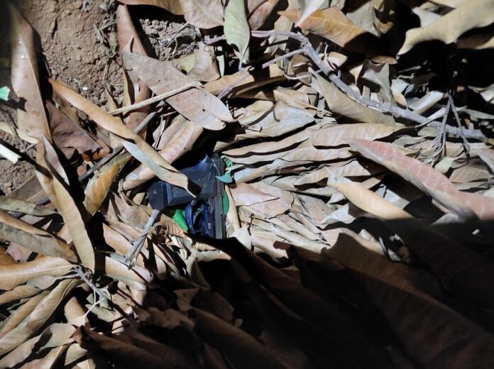 A equipe policial fez uma varredura na área e encontrou itens como uma máscara balaclava, dois moletons, outras peças de roupas, boné, um celular e uma pistola de calibre 380, sem numeração aparente, com um carregador com 10 munições.