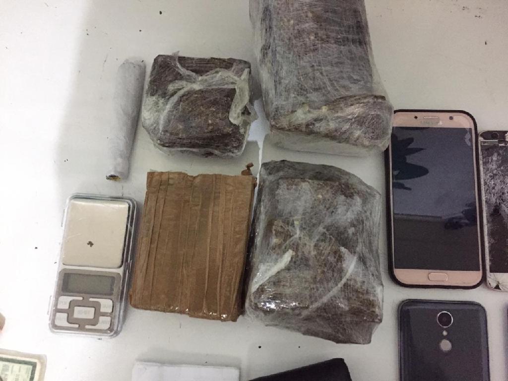Na residência, a PM prendeu os suspeitos T.C.H. R. S e A.M.C.S, clientes do suspeito que estavam adentrando à casa no momento da abordagem policial. No local, a polÃcia apreendeu meio tablete de maconha, que foi encontrada em uma caixa no guarda-roupa, também havia uma balança de precisão e um cigarro grande de maconha.