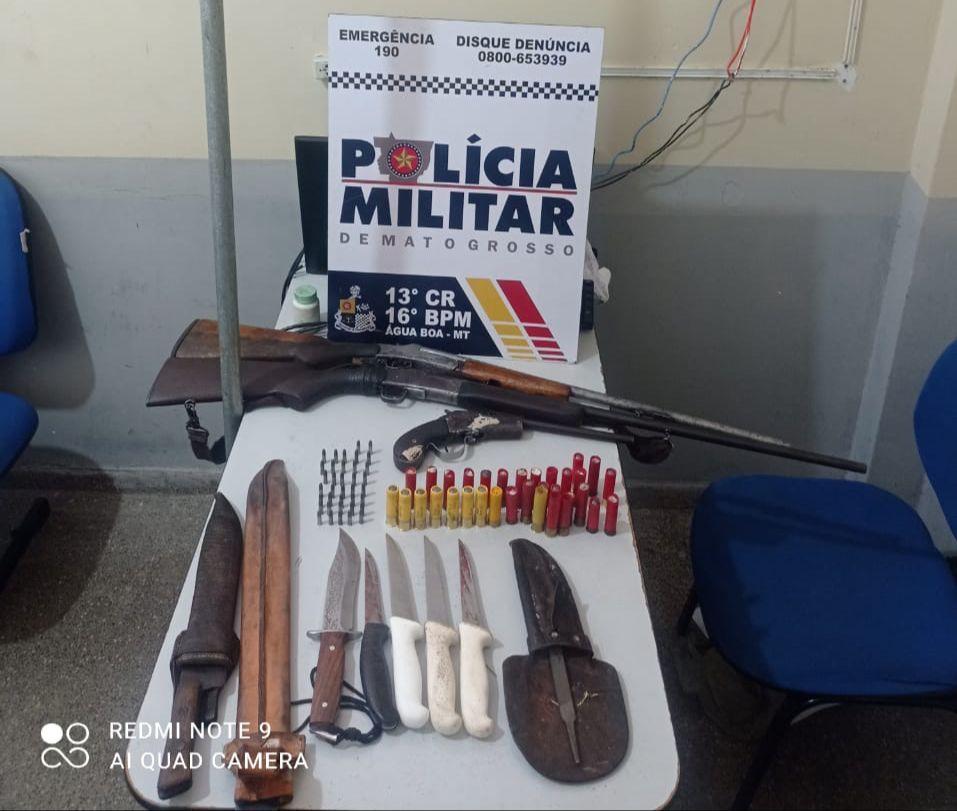 Um homem de 66 anos foi preso em flagrante pela Polícia Militar pelos crimes de caça e porte de arma ilegais e maus-tratos a animais, na tarde deste sábado (04.06), na zona rural de Água Boa. Na ação, três armas de fogo e facas foram apreendidas, enquanto seis cães maltratados, utilizados na caça de animais silvestres, foram resgatados.