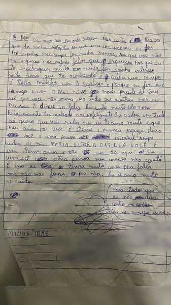 O texto termina com o suspeito pedindo desculpas para as outras pessoas que ele conhecia e para quem não escreveu nada. “Eu não consegui”, alegou. Na sequência, ele deixa telefones de contato de familiares.