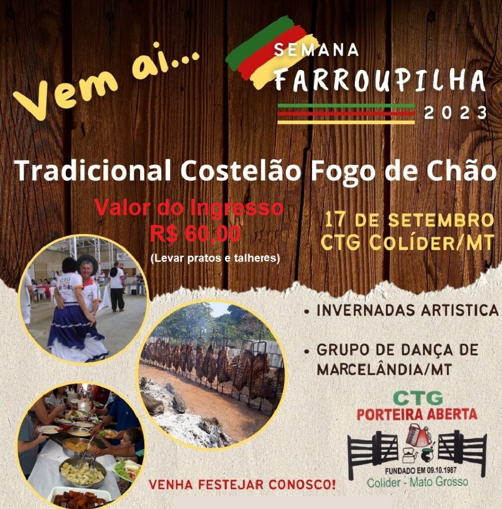 Neste domingo, dia 17/09, a partir das 11h, a comunidade de Colíder e região terá a oportunidade de vivenciar momentos de grande descontração e alegria em nosso galpão. Neste dia será realizado o tradicional Costelão Fogo de Chão, recheado com emocionantes apresentações artísticas, contando com a participação de grupos de dança de invernada artística da cidade de Marcelândia. Além disso, é claro, terá uma tarde animada de fandango, ao som dos grupos musicais “Os Guris”, de Terra Nova do Norte, e “Nelsinho Lang”, de Alta Floresta.