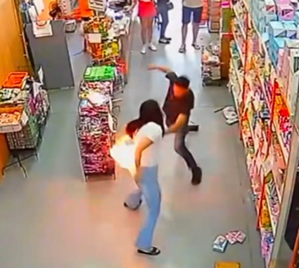 O acidente aconteceu no sábado (8). A explosão acontece próximo a um balcão onde a jovem e o marido olhavam alguns produtos. A princípio, a mulher se afasta do balcão em direção a uma prateleira. Em seguida, ela sai correndo tentando apagar o fogo em sua roupa.
