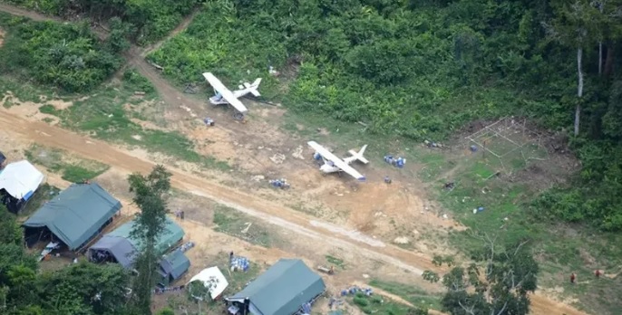 “Currutela” no alto Catrimani, além de pista de pouso clandestina. Aeronaves dão suporte à atividade. — Foto: Divulgação/HAY