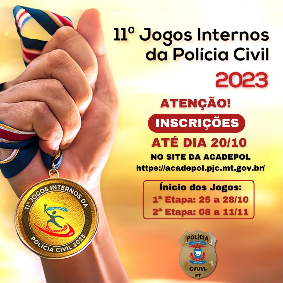 A Academia de Polícia (Acadepol) lembra os servidores e equipes de todas as Regionais do Estado que as inscrições para a 11ª edição dos Jogos Integração da Polícia Civil estão abertas até o dia 20 de outubro. A abertura oficial do evento, promovido pela Polícia Civil e Acadepol com apoio de patrocinadores, acontece no dia 26 de outubro no Ginásio Dom Aquino, em Cuiabá.