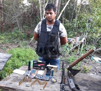 Próximo do detido foi localizada outra arma, se tratando de um Rifle Calibre 22 que também foi apreendida durante a ocorrência. Ao localizar o barraco dos suspeitos e durante as revistas foram encontradas munições de calibres 22, 38, 44 e um silenciador da arma calibre 44 e também uma capa de colete. Todo material fora recolhido a título de prova do crime.