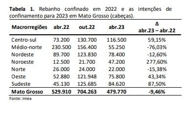 O Instituto Mato-Grossense de Economia Agropecuária (Imea) divulgou o primeiro levantamento das intenções de confinamento em 2023 de Mato Grosso. Os dados da pesquisa apontaram que o estado deve confinar 31,88% a menos de bovinos neste ano, no comparativo consolidado de 2022, quando 704.263 cabeças foram terminadas no cocho. A expectativa é que este ano, sejam confinados cerca de 479,77 mil animais.