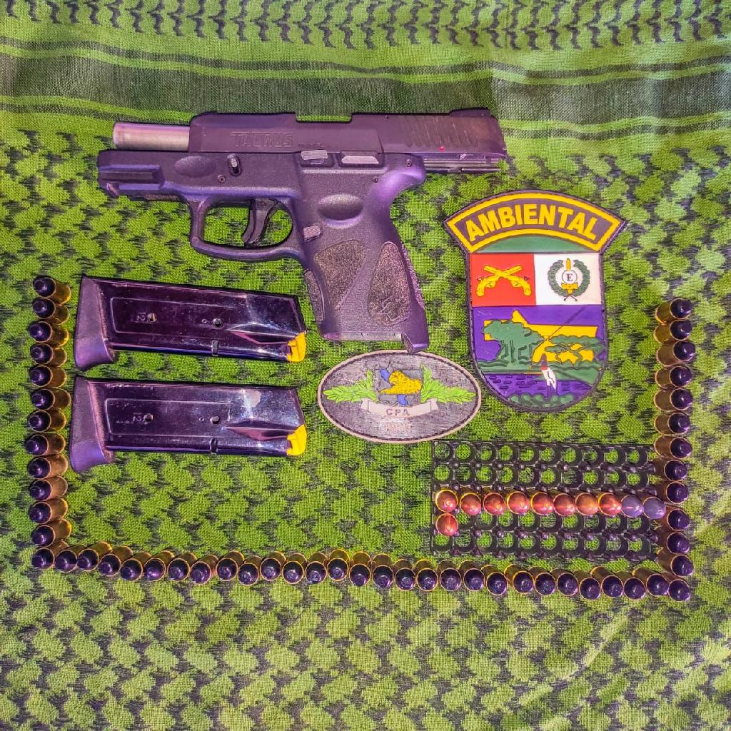 Durante revista pessoal com um dos suspeitos, os policiais encontraram uma arma modelo Taurus, calibre 9 milímetros, municiada. Os militares encontraram ainda um estojo com munições do mesmo calibre totalizando 64 munições.
