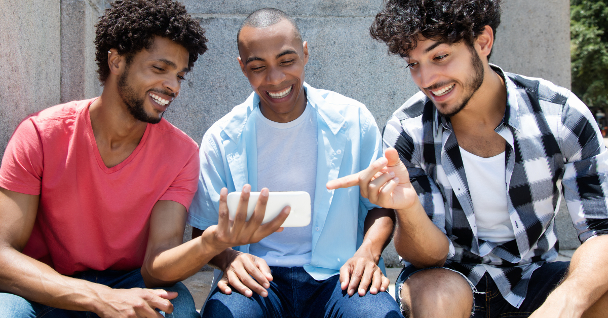 Groupon african american an caucasian hipster man watching sports game live on phone outdoors in the summer