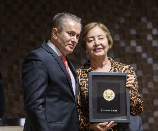 Segunda imagem: desembargador Orlando Perri e a presidente do TJMT, desembargadora Clarice Claudino da Silva, posando para foto. A presidente segura a medalha do selo Daqui pra Frente, recebida do supervisor do GMF. Os dois estão em pé, em primeiro plano.