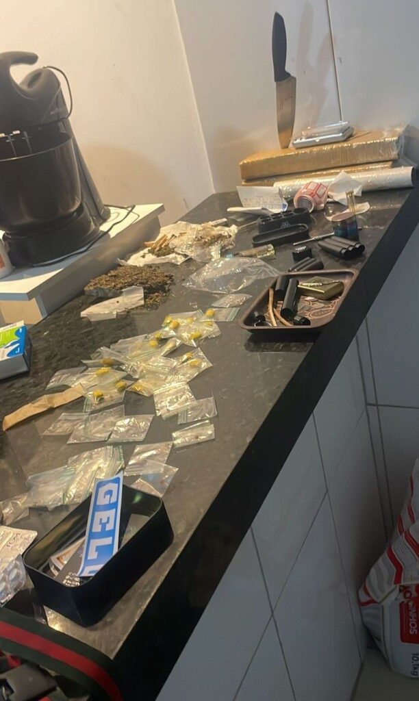 A Força Tática entrou na residência e verificou que o local servia como ponto de distribuição e fabricação de drogas.