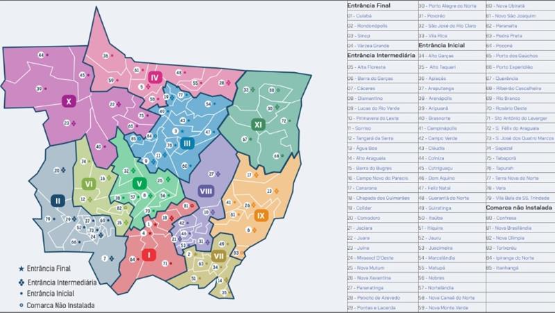 Corregedoria-Geral da Justiça de Mato Grosso (CGJ-MT) disponibiliza lista das comarcas do Estado, por ordem cronológica de instalação. Até então a listagem era dividida em entrâncias final, intermediária, inicial e não instalada. Atualmente o Estado possuí 79 comarcas instaladas e 83 criadas.