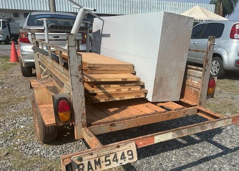 A equipe de investigação foi ao local e flagrou um veículo Ford KA com uma carreta acoplada e alguns materiais dentro, entre eles uma mesa escolar, um armário e placas de madeira compensada.