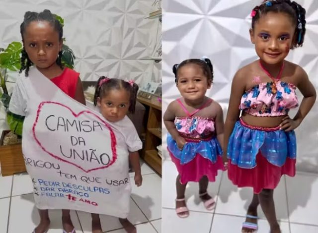 A mãe, Priscila, fez uma camisa da união para as duas filhas em Estância, Sergipe. As irmãs estavam brigando e a ideia ganhou a internet – Foto: redes sociais