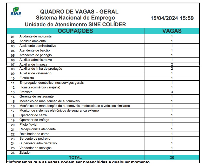 VAGAS DE EMPREGO EM COLIDER