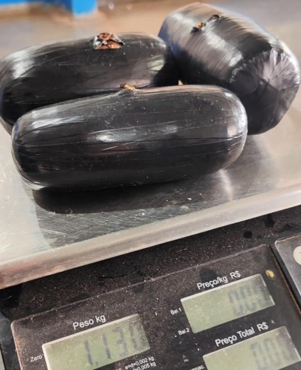 Os invólucros foram posteriormente identificados como duas porções de maconha e uma de cocaína, pesando pouco mais de 1.1 kg.