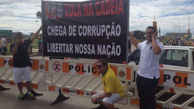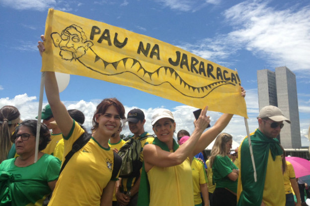 Com uma faixa em que se lia “Pau na jararaca” sobre o desenho de uma cobra com o rosto de Lula, a professora de biologia da UnB Regina Helena Macedo, 57, fazia sucesso na manifestação de Brasília. Muitos faziam fila para tirar fotos com a faixa.