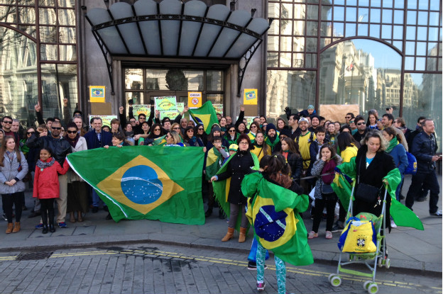Cerca de 50 manifestantes protestam contra a presidente Dilma Rousseff em frente à embaixada do Brasil em Londres. Eles pedem o impeachment da petista e a prisão do ex-presidente Luiz Inácio Lula da Silva. O protesto começou por volta das 14h (11h de Brasília).