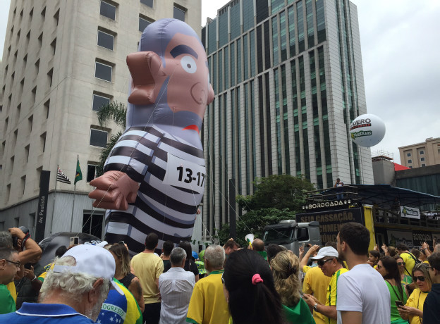 O boneco Pixuleco, que representa o ex-presidente Lula com roupa de presidiário, é inflado sob aplausos na avenida Paulista. A manifestação em São Paulo está marcada oficialmente para 14h30, mas a avenida já está cheia de manifestantes vestindo verde e amarelo.