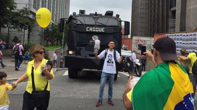 Diversos manifestantes aproveitaram a presença de um carro da tropa de choque para tirar fotos e selfies. O ajudante de transportes Charles Oliveira, 26, foi um deles. “Apoio Bolsonaro para presidente e por isso apoio os militares “, disse Oliveira, morador de Pirituba, que afirmou esperar que Lula seja preso nos próximos dias.