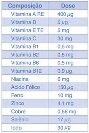 Composição do sachê de micronutrientes – Vitamina A RE (400 µg), Vitamina D (5 µg), Vitamina E TE (5 mg), Vitamina C (30 mg), Vitamina B1 (0,5 mg), Vitamina B2 (0,5 mg), Vitamina B6 (0,5 mg), Vitamina B12 (0,9 µg), Ferro (10 mg), Zinco (4,1 mg), Cobre (0,56 mg), Selênio (17 µg) e Iodo (90 µg).
