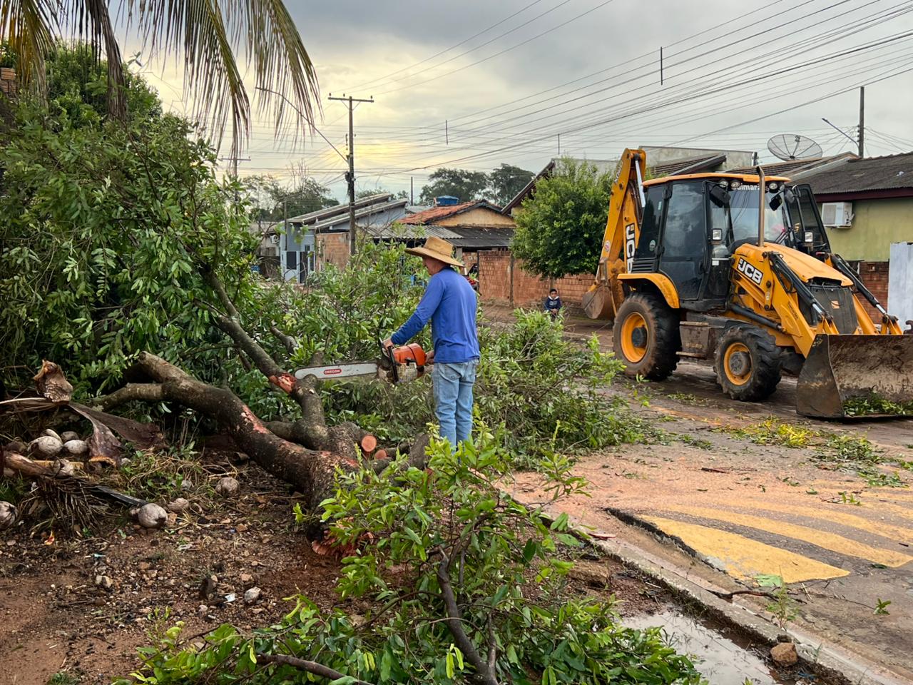 O evento climático resultou em queda de árvores, destelhamento de imóveis, obstrução de vias públicas e avarias em estabelecimentos comerciais.