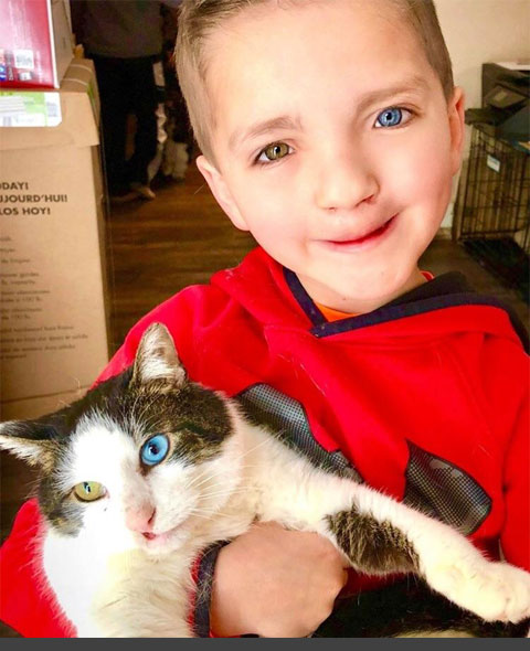 Companheiro na amizade e na semelhança. Um garotinho adotou um gato com os olhos diferentes, como os dele, e o lábio também. O menino Madden tem Heterochromia Iridum – a Ãris de um olho tem cor diferente da Ãris do outro olho. Ele também tem lábio com fissura, mais conhecido como lábio leporino. Madden, que é um menino gentil e doce, foi vitima de bullying no ônibus da escola e ficou com a autoestima afetada.