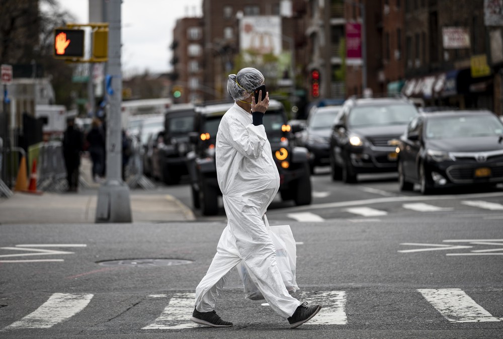 Mulher grávida é vista com roupas protetoras contra a Covid-19 em Nova York, no dia 27 de abril. — Foto: Johannes Eisele / AFP