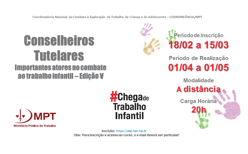 O Ministério Público do Trabalho (MPT), por meio da Coordenadoria Nacional de Combate à Exploração do Trabalho da Criança e do Adolescente (Coordinfância), com o apoio do Departamento de Desenvolvimento de Pessoas/DGP, está com as inscrições abertas para o curso a distância gratuito “Conselheiros Tutelares: importantes atores no combate ao trabalho infantil”.